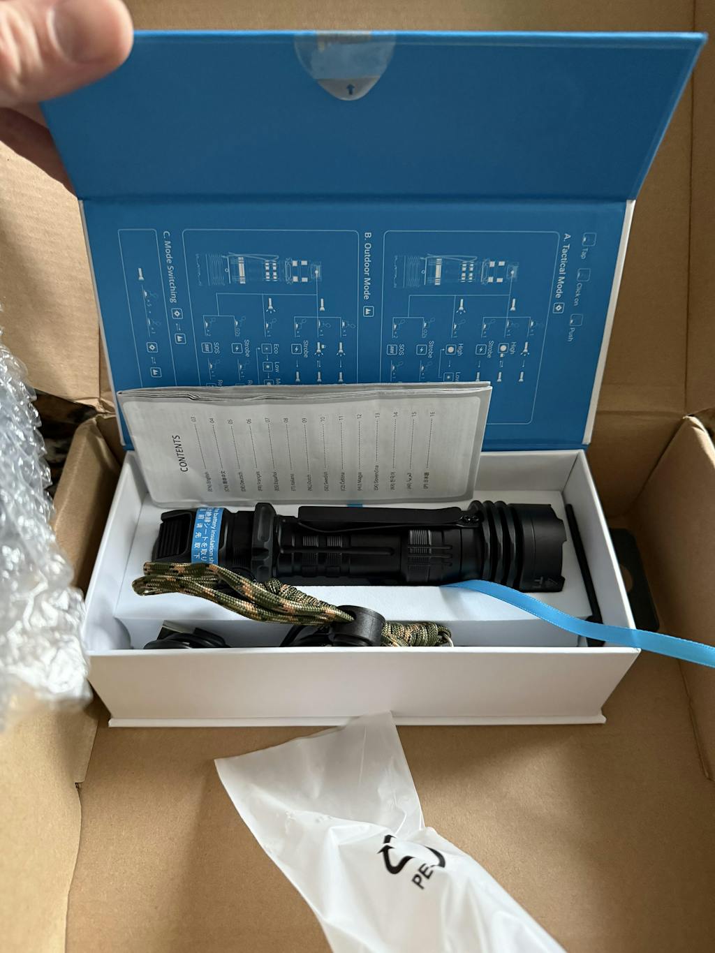 Einzigartiger Hebel-Heckschalter: Das einzigartige Heckdesign ermöglicht es, durch Drücken verschiedene Beleuchtungsmodi zu erreichen. Außerdem können der Outdoor-Modus und der taktische Modus jederzeit schnell gewechselt werden.